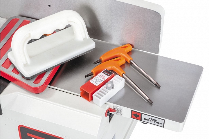 Благодаря настольной компоновке, легкому коллекторному мотору, чугунным столам и валу helical станок JSJ-6 HH удачно (не в ущерб рабочим параметрам) совмещает компактность и мобильность любительских моделей с мощностью, качеством строгания и производительностью профессиональных фуганков.