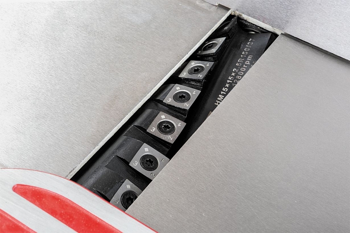 Кромка сегментов, расположенных по спирали, сделана скругленной (радиусной). Сами элементы выполнены из твердого сплава и имеют четыре рабочие стороны, что позволяет трижды переворачивать их до замены. К слову, замена (поворот) производятся выборочно только для поврежденных лезвий, что снижает расходы на эксплуатацию. При обновлении не требуется регулировка — ножи просто привинчиваются к своим местам.